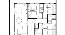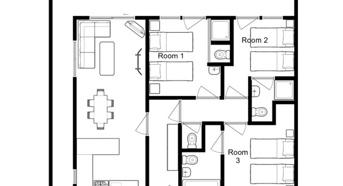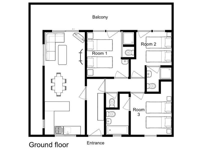 The open-plan lounge with soft seating for six wraps around a central stone fireplace, while the adjoining dining area has room for seven. All three bedrooms feature en-suite bathrooms for added convenience.