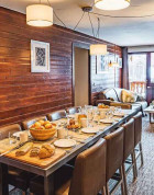 All bedrooms have private bathrooms and reflect a traditional mountain style with quality bedding, warm tones, and soft lighting. The open-plan living and dining area features a large table, plush seating, and direct access to a sunny balcony.
